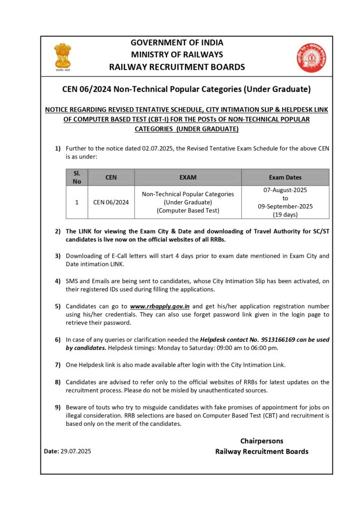 ✅ RRB NTPC 10+2 Level CBT 1 Exam City 2025 Released